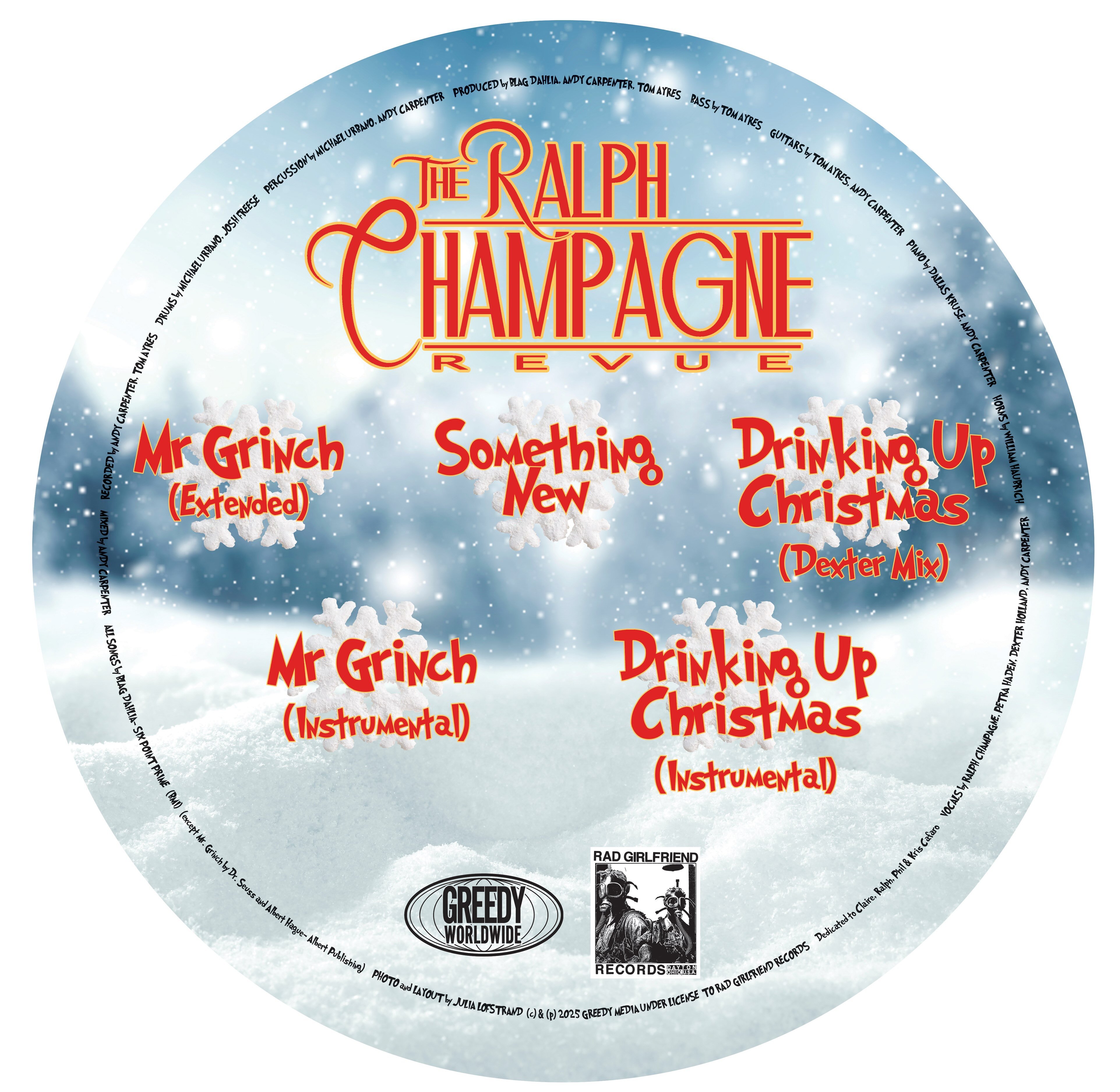 The Ralph Champagne Review’s Grinch Mini LP is a wild, witty, and impeccably crafted holiday detour from Ralph Champagne, the crooning, country-soaked alter ego of Blag Dahlia, legendary frontman of The Dwarves. Pressed on a striking Christmas-themed picture disc, this limited release blends holiday nostalgia with Dahlia's sly humor and high-gloss songwriting, delivering a festive record with more personality than anything else under the tree. At the center of the LP is “Drinking Up Christmas,” a boozy, reimagined spin on the Dwarves’ classic “Better Be Women.” The track features a standout guest appearance from Dexter Holland of The Offspring, whose unmistakable vocals add punch and playful irreverence to the song’s holiday makeover. Equally compelling is “Something New,” elevated by the rich, shimmering harmonies of Petra Haden (That Dog. The musicianship across the Grinch Mini LP is nothing short of stellar. Josh Freese (Foo Fighters, Devo, everywhere), Tom Ayres, and producer Andy Carpenter shape the record with precision—tight grooves, vibrant arrangements, and a vintage-leaning palette that feels at once classic and deeply original. No Christmas record would be complete without a nod to tradition, and Ralph Champagne delivers with a spirited version of the holiday staple “Mr. Grinch.” Rounding out the release are instrumental versions of both “Mr. Grinch” and “Drinking Up Christmas,” highlighting the craftsmanship and detail that make this project shine even without vocals. Festive, irreverent, and musically top-tier, the Grinch Mini LP is an essential holiday collectible for Dwarves fans, punk lifers, and anyone who likes their Christmas spirit served with style, swagger, and a wink.
